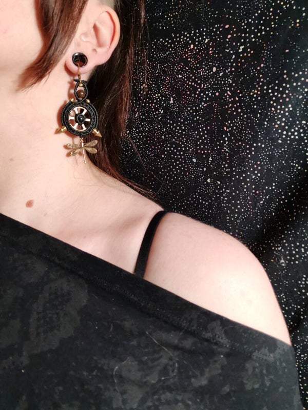 Plongez dans l'univers steampunk avec ces boucles d'oreilles uniques, tissées à la main dans notre atelier. Ces créations artisanales intègrent des engrenages dorés, des libellules en bronze patiné, ainsi que des perles en bronzite et en œil de faucon, soigneusement sélectionnées pour leur éclat et leurs propriétés.