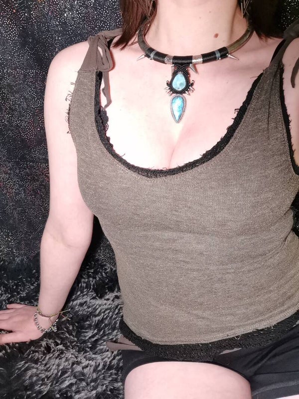 Chaque pierre, sélectionnée avec soin, éclatante de reflets hypnotiques et d'énergies apaisantes, confère à ce collier torque une aura de mystère, de force et de tranquillité.
