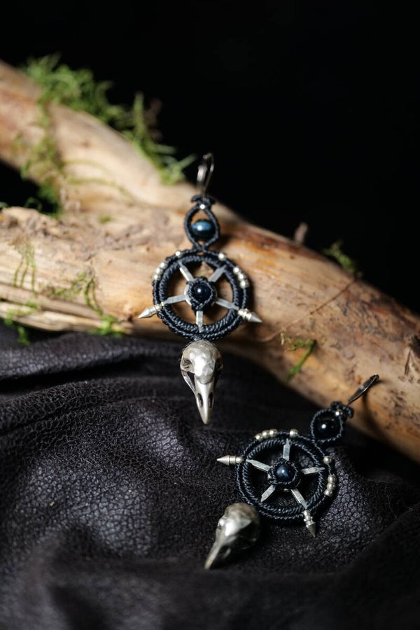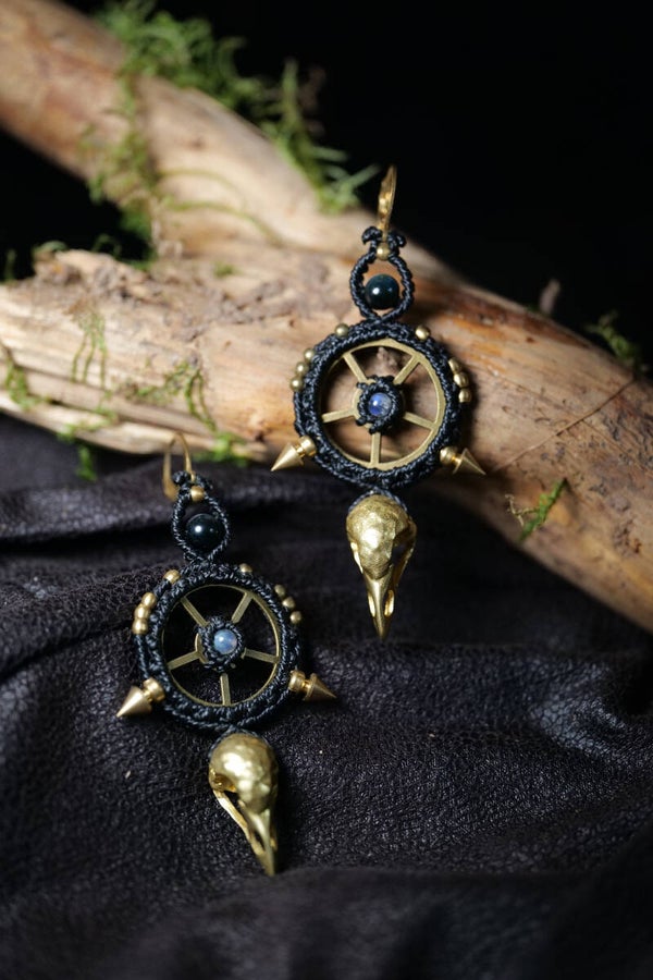 Ces créations captivantes associent des engrenages dorés ou argentés, des crânes de corbeaux, et des pierres naturelles de labradorite et œil de faucon, le tout habilement travaillé grâce à la technique du micro macramé.